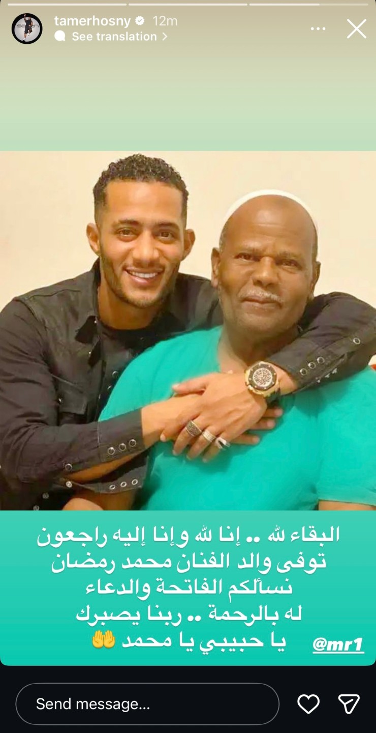 نعى الفنان تامر حسني، والد الفنان محمد رمضان، الذي وافته المنية فجر اليوم.