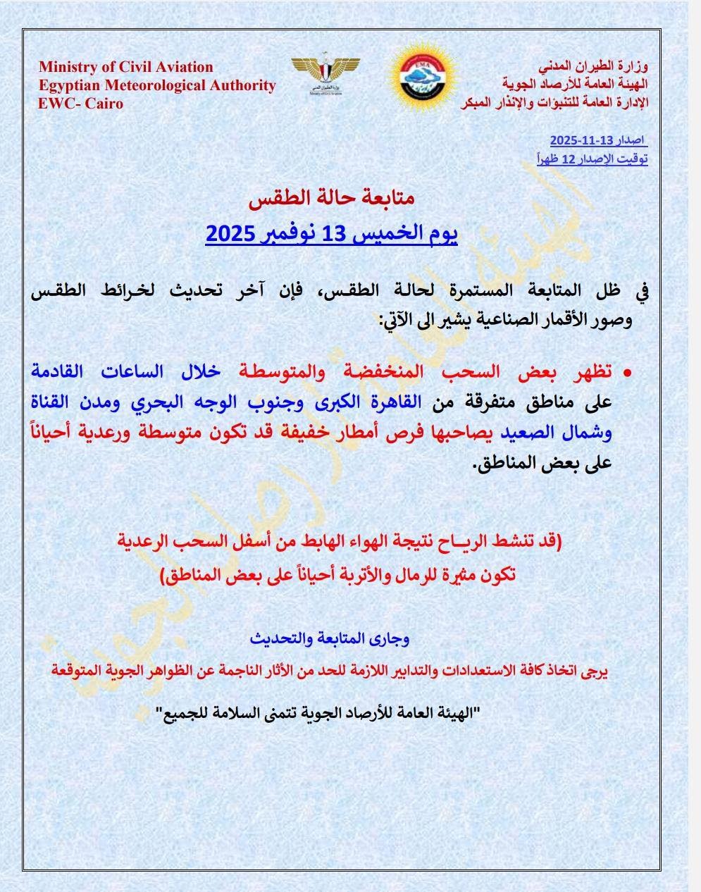 أعلنت الهيئة العامة لـ الأرصاد الجوية تفاصيل حالة الطقس والظواهر الجوية المتوقعة اليوم الخميس 13 نوفمبر 2025.