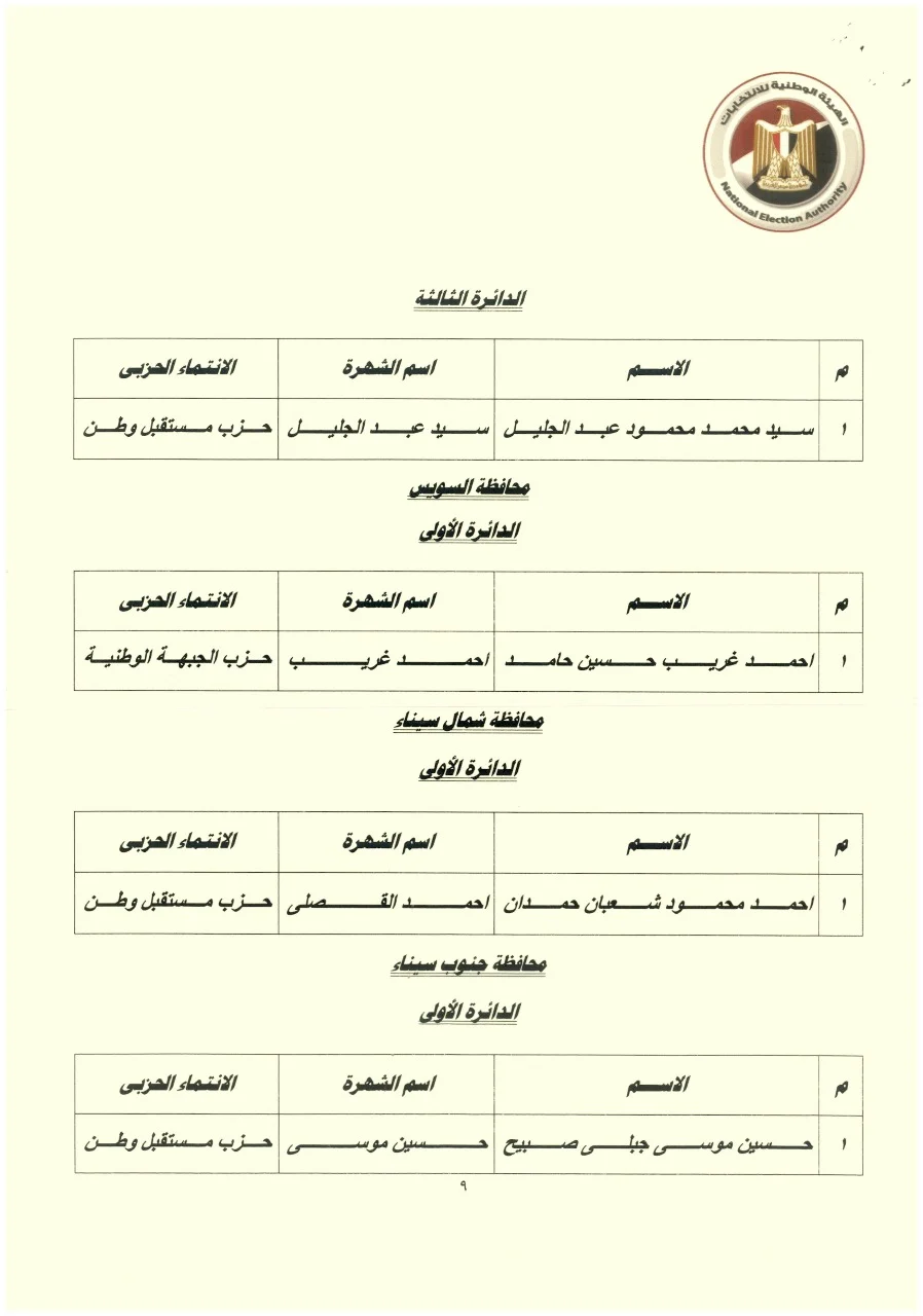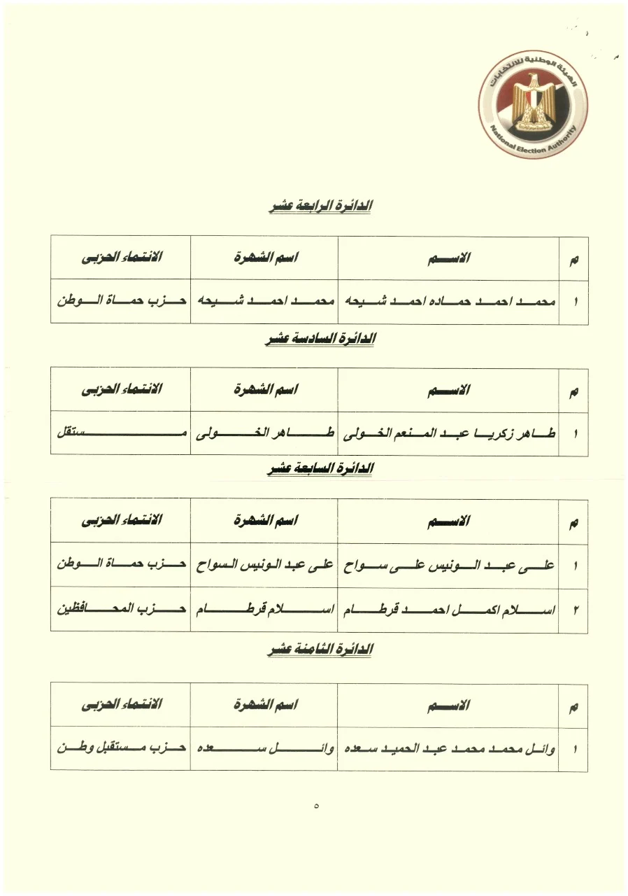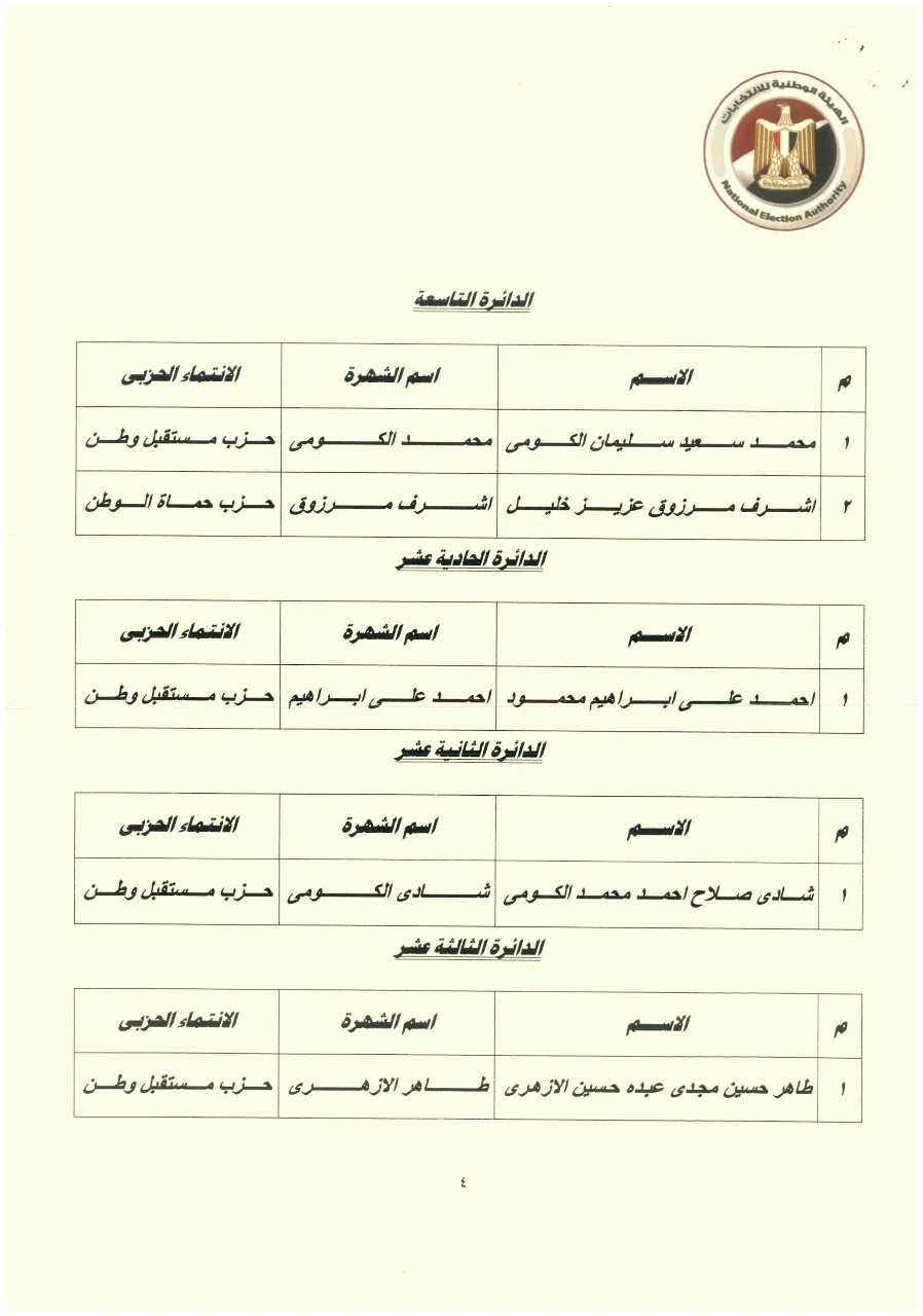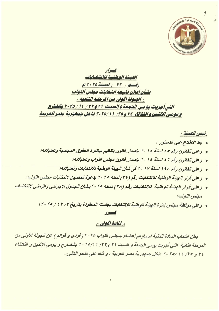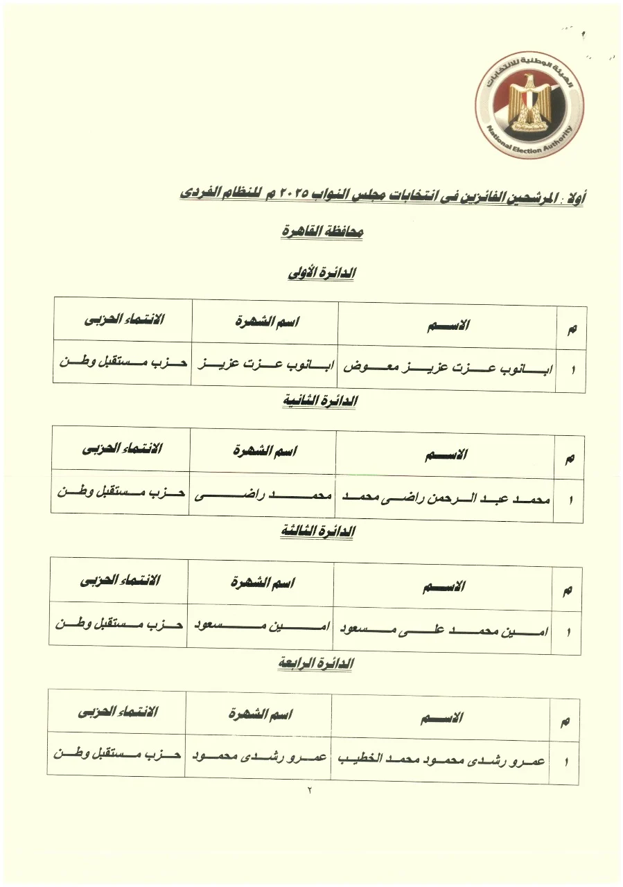 أعلنت الهيئة الوطنية للانتخابات النتيجة الرسمية أسماء المرشحين الفائزين بالنظام الفردى بالمرحلة الثانية لانتخابات مجلس النواب.