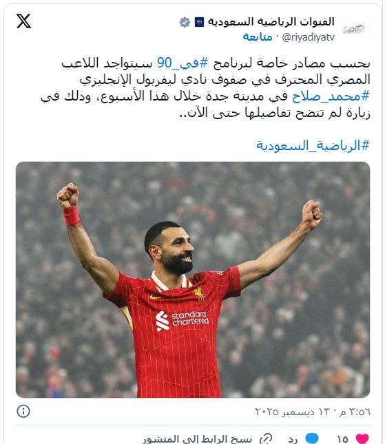 وكتب الحساب الرسمي للقناة عبر منصة “إكس”: “بحسب مصادر خاصة لبرنامج #في_90 سيتواجد اللاعب المصري المحترف في صفوف نادي ليفربول الإنجليزي #محمد_صلاح في مدينة جدة خلال هذا الأسبوع، وذلك في زيارة لم تتضح تفاصيلها حتى الآن.”.